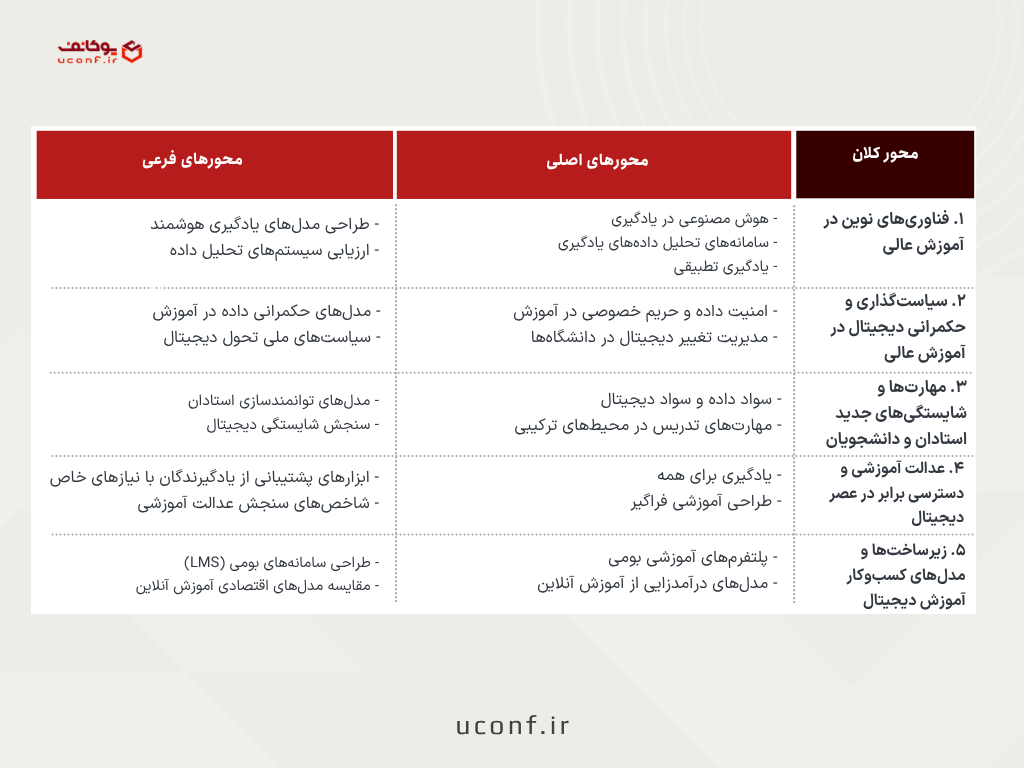 بنابراین، محورها باید حول چالشها و فرصتهای تحول دیجیتال در محیطهای دانشگاهی بچرخند.