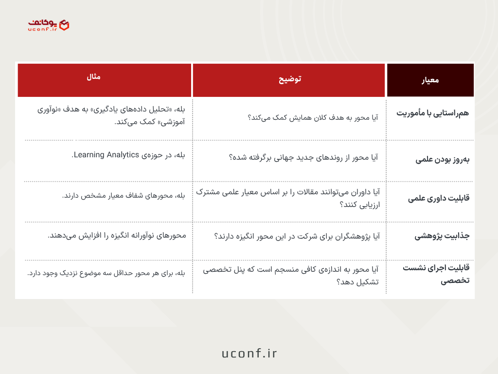 اما اگر محورها کلی یا خارج از مسیر باشند، مثلاً «مدیریت زمان در دانشگاهها» یا «روشهای تدریس سنتی» — عملاً همایش از مأموریت علمی خود دور میشود.